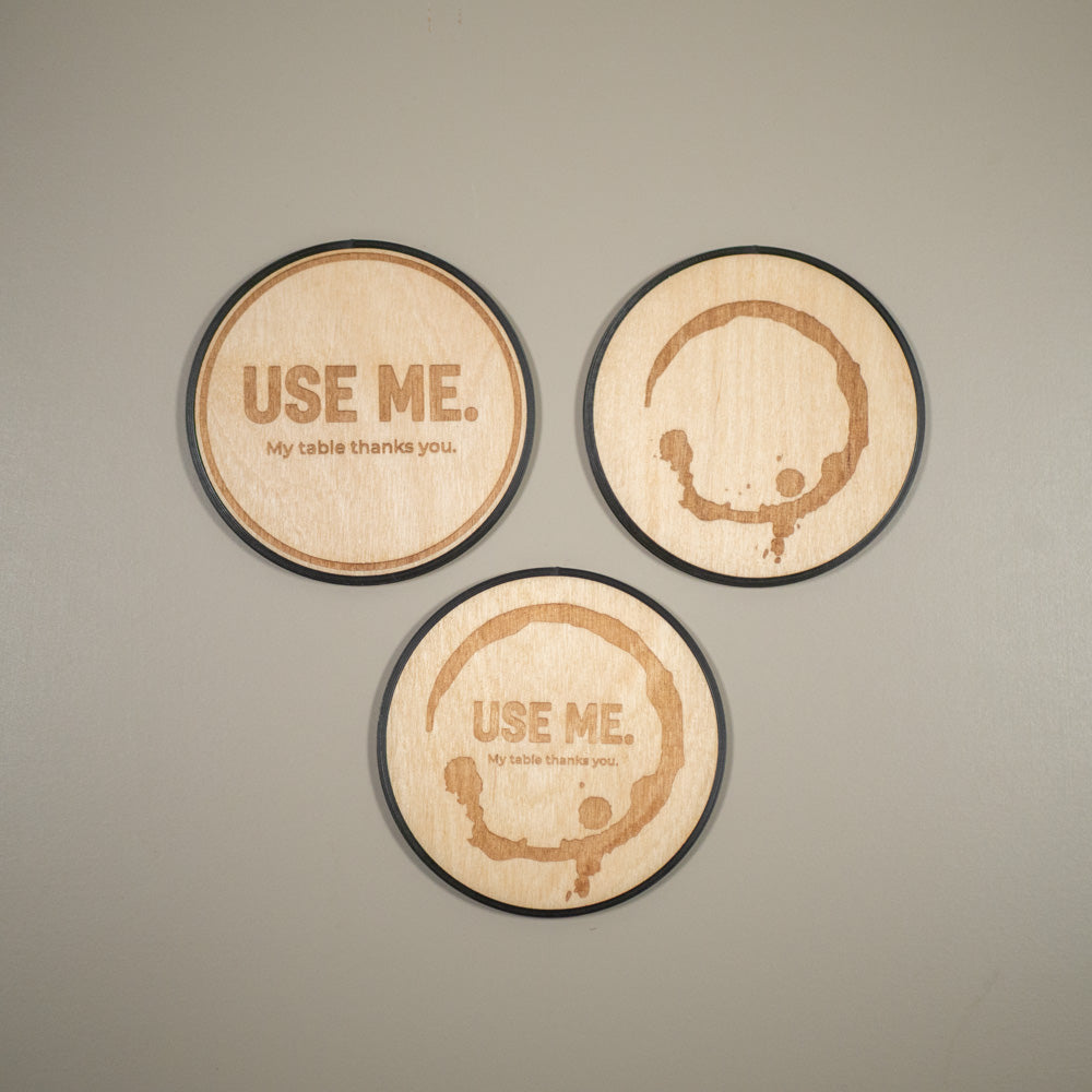 Protect your coffee table with these fake coffee stain wooden coasters. Engraved to look like a realistic drink stain - A low brow attempt at encouraging friends and family to use a coaster.