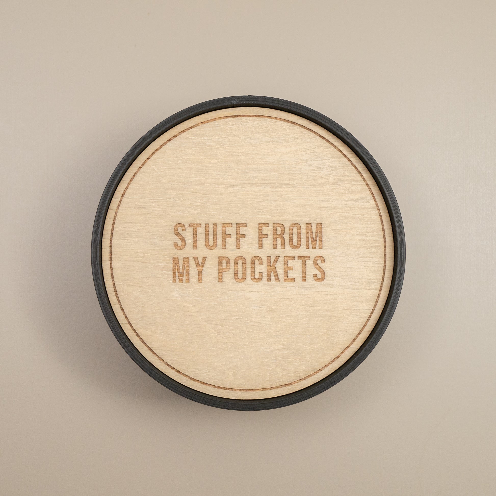 Keep your surfaces clutter-free with this handy little trinket dish / catchall tray. Raised on three small legs, it features a sleek black frame and a wooden base engraved with a playful quote.